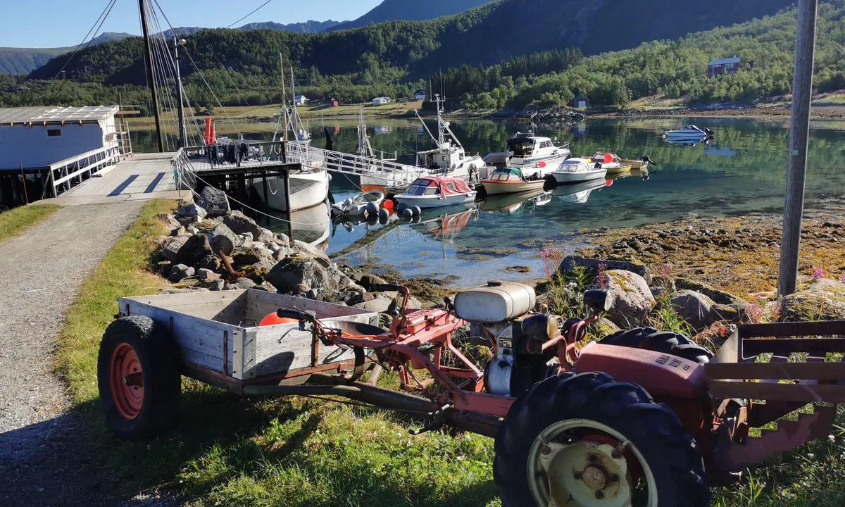 Flytbrygga, långsides. Bra djup. Start markerade vandringsleder till Dalknölarna och Nipa på Helgenestinden, eventuellt längs landsvägen (3,5 km).
